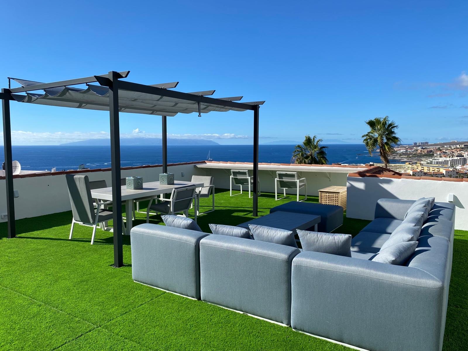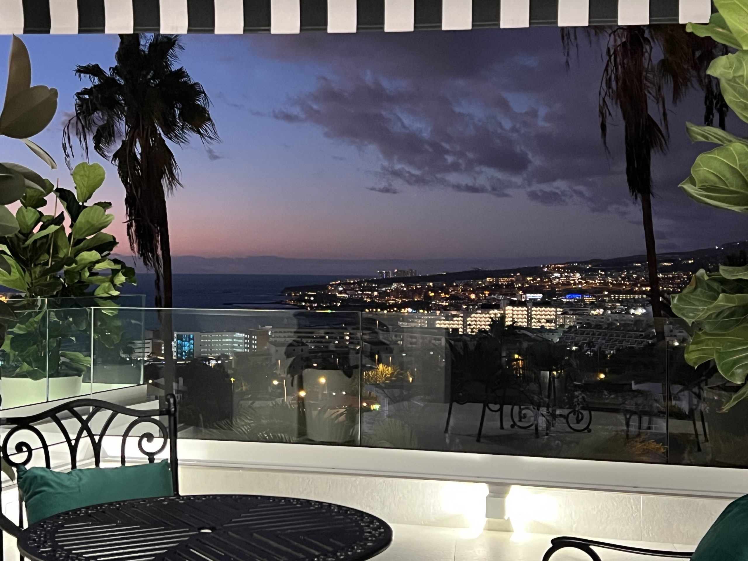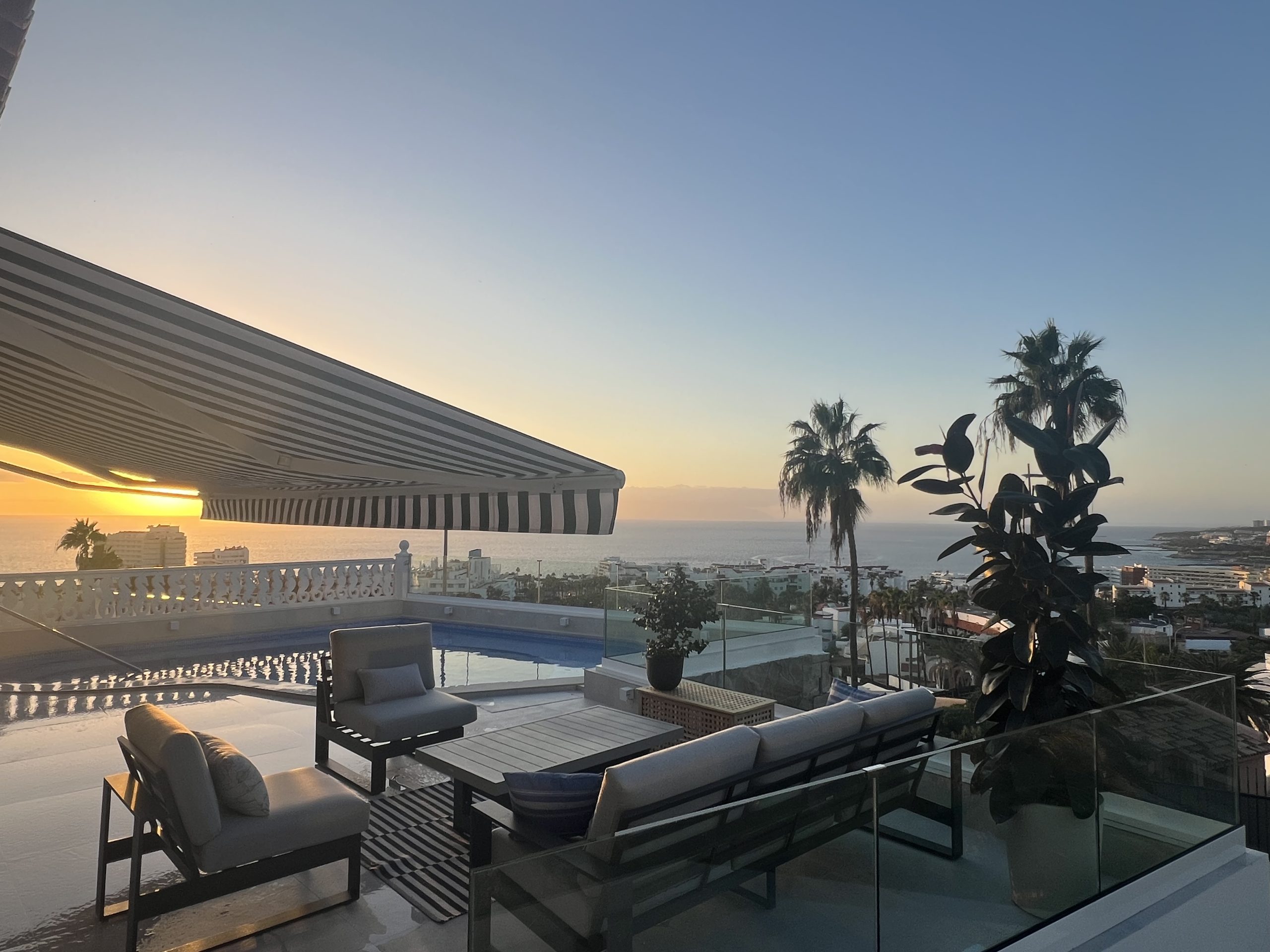 En la popular urbanización San Eugenio, encontrará esta espaciosa y luminosa casa de dos plantas, donde la zona de estar principal y los dormitorios se encuentran en una sola planta. Dispone de tres amplios dormitorios, uno de ellos con acceso a una terraza cubierta en la parte delantera de la villa, tres baños y un aseo de cortesía. El salón es muy amplio y se abre a una gran terraza de 144 m² con piscina privada e impresionantes vistas al océano, la isla de La Gomera y la costa.