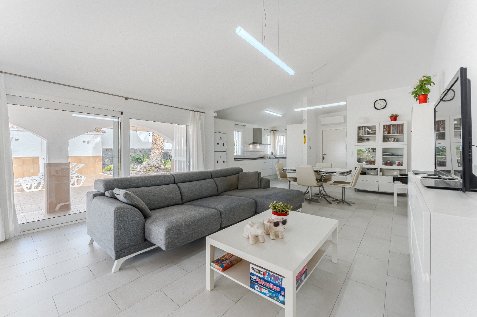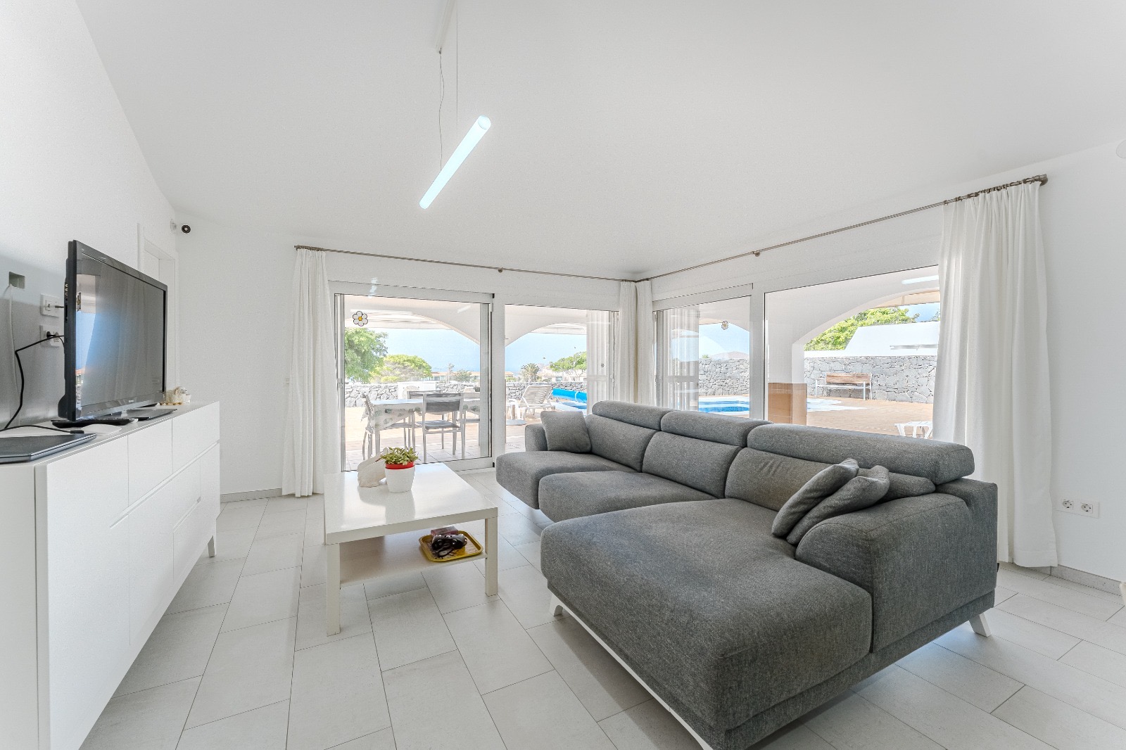 Bungaló en una gran parcela, justo al lado del campo de golf y con impresionantes vistas al mar. La propiedad de 134 m² de superficie habitable, 102 m² de superficie útil, ha sido completamente renovada con gran atención al detalle y materiales de alta calidad. Consta de: 3 dormitorios, 2 baños, un amplio y luminoso salón con moderna cocina abierta y una enorme terraza orientada al sur con una gran piscina climatizada.