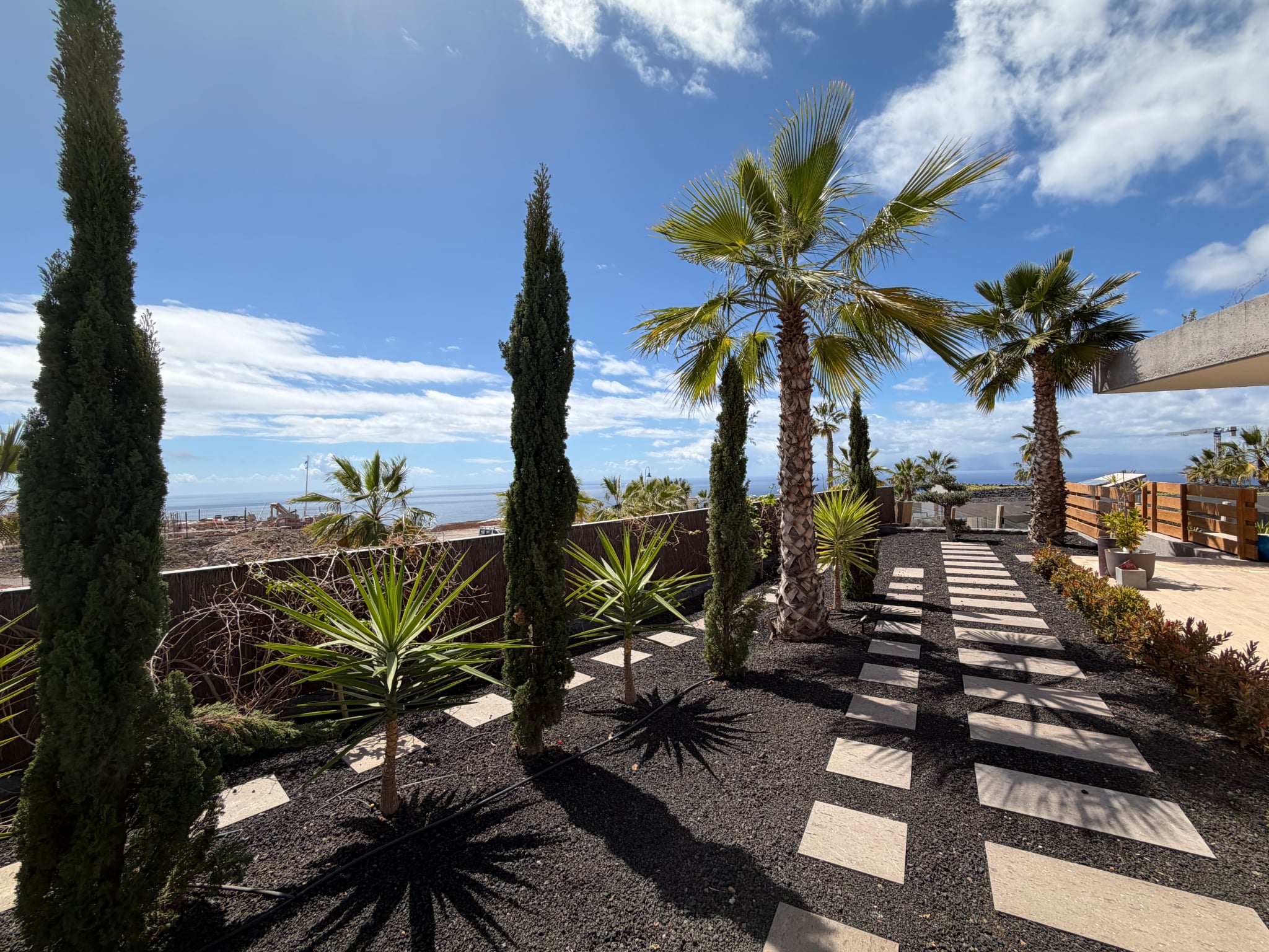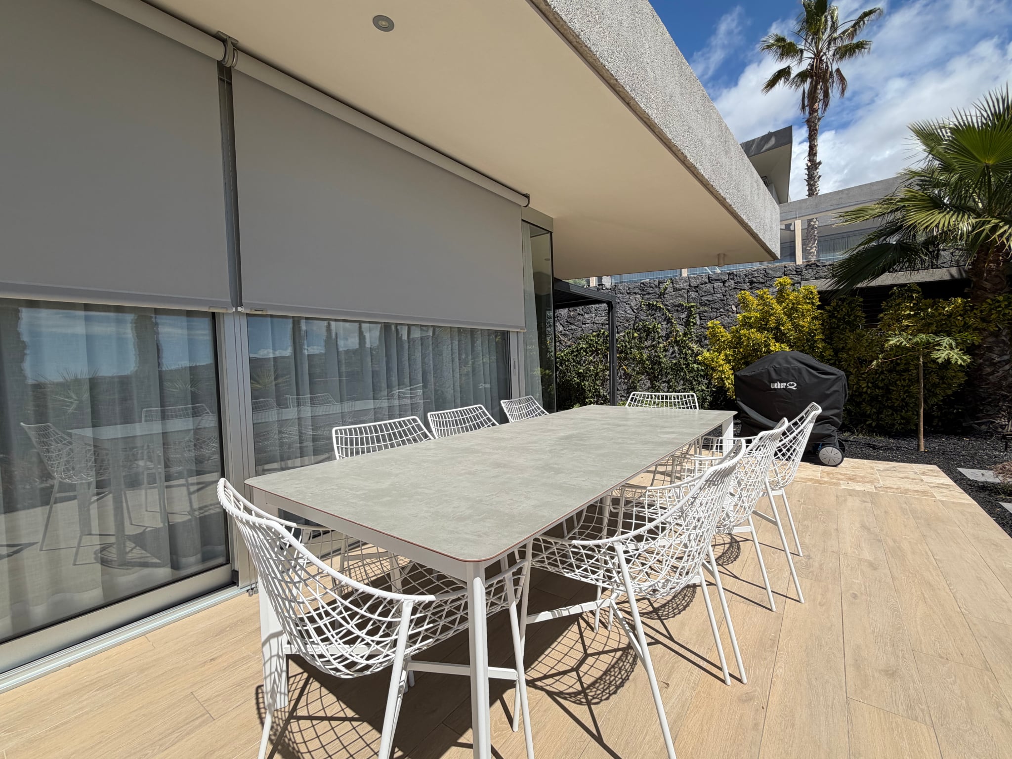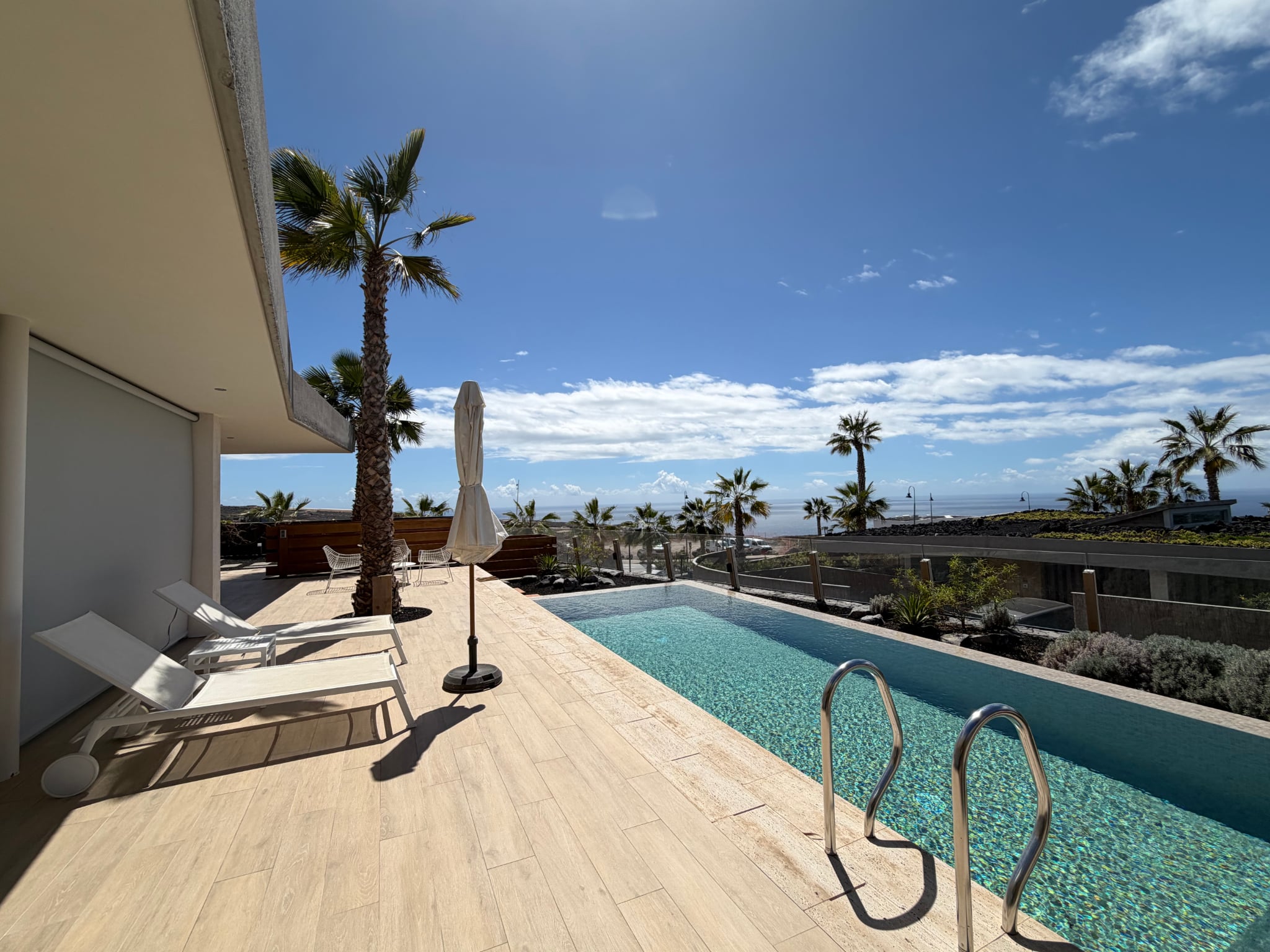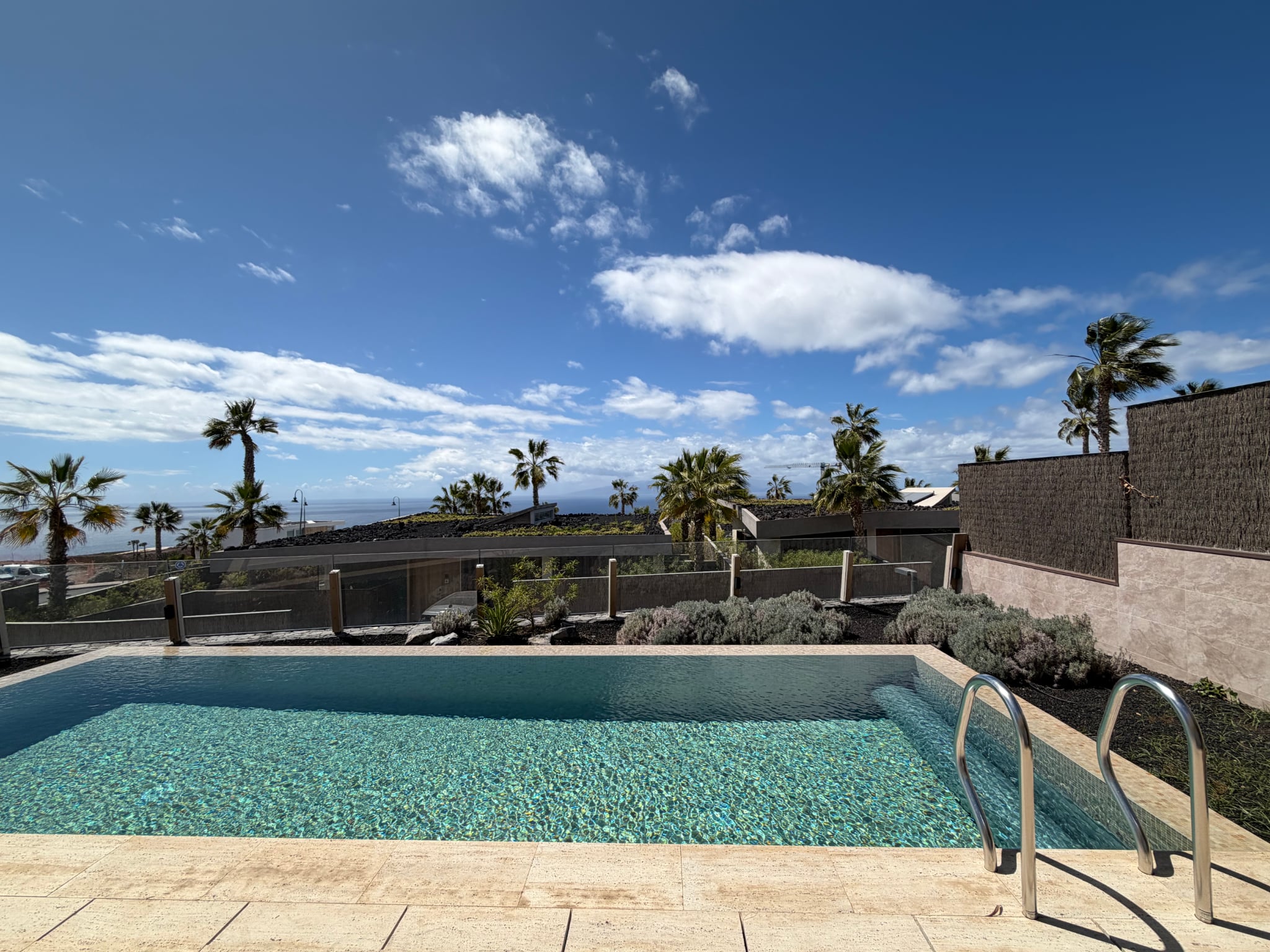 La villa cuenta con 3 amplios dormitorios con vestidores, 2 baños modernos con duchas, un salón luminoso con grandes ventanales que se abren a la terraza y al jardín. La piscina infinity privada y climatizada es perfecta para refrescarse y disfrutar del clima de Tenerife, mientras que el exterior incluye zonas para comer al aire libre y relax.
