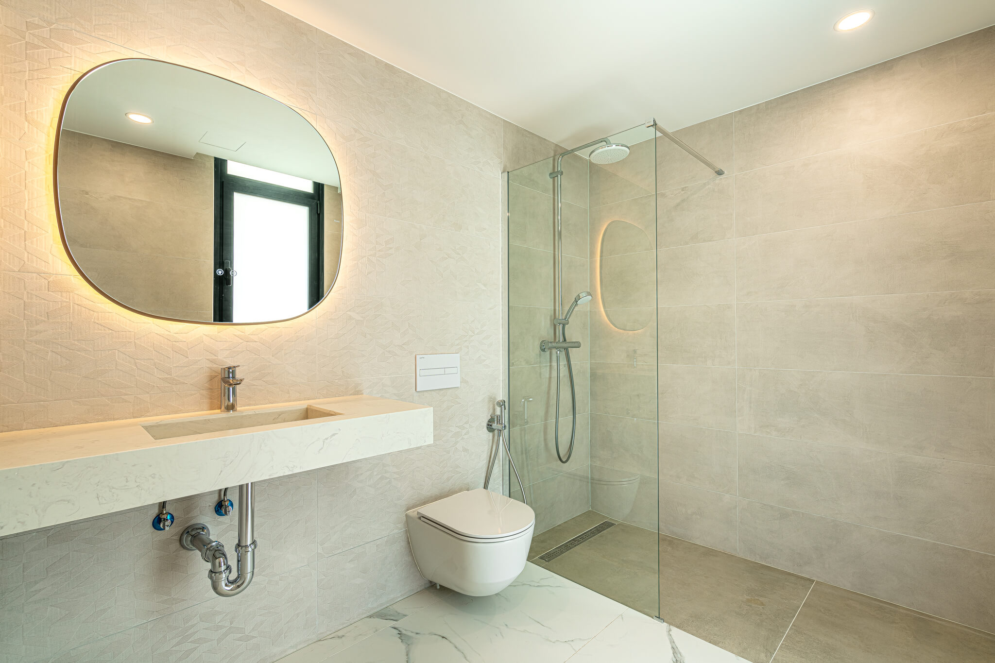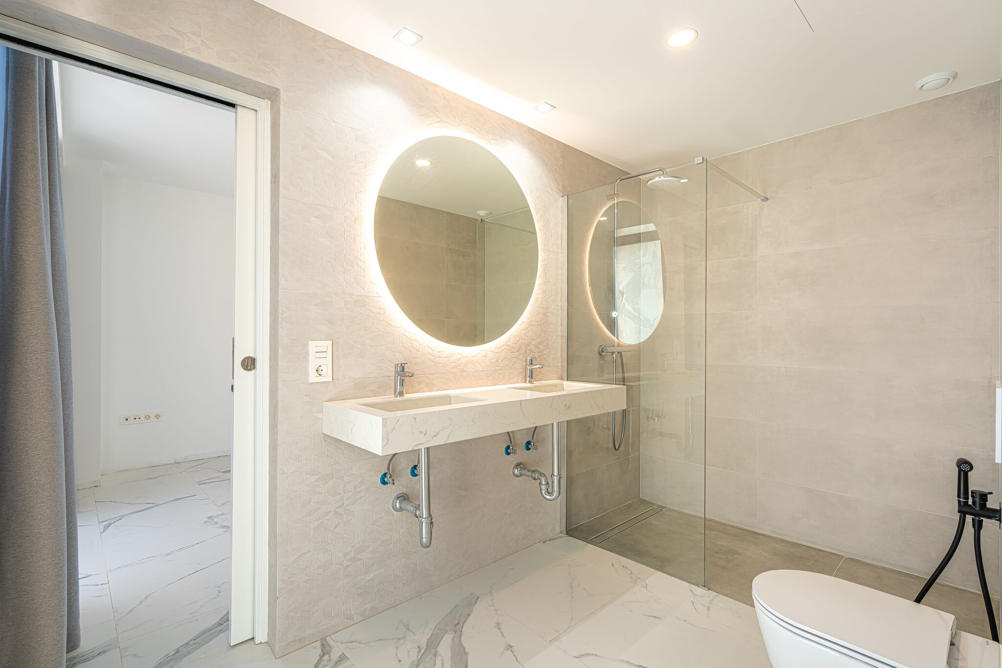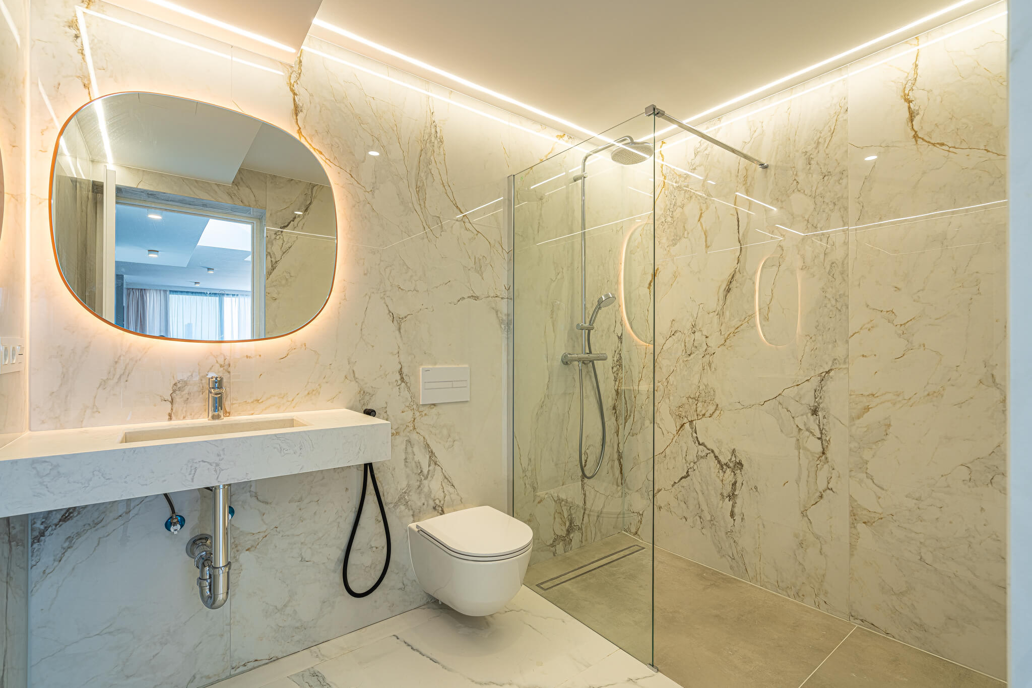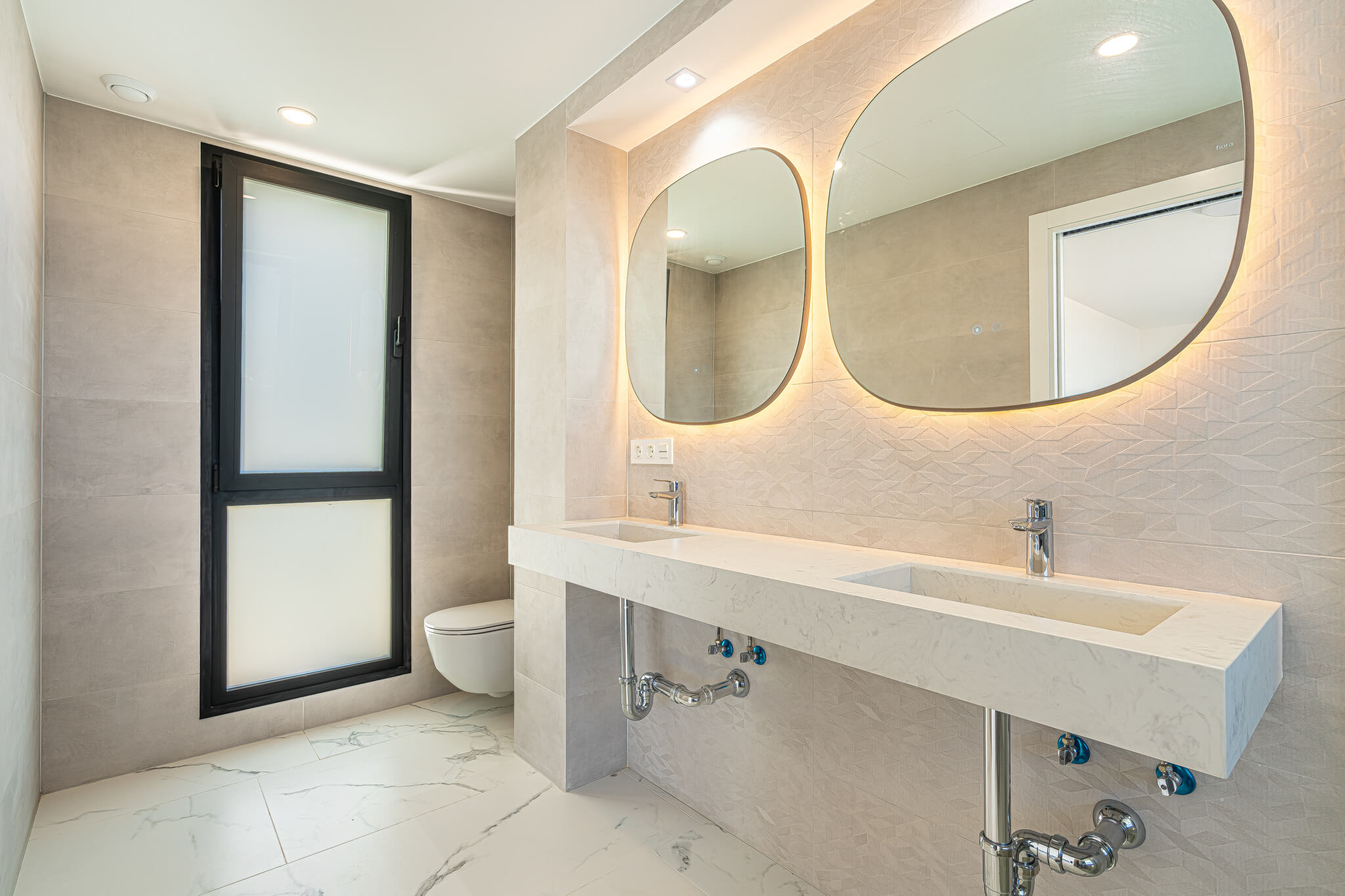 Baños de alta gama con grifería y sanitarios integrados, gran atención al detalle y acabados impecables.