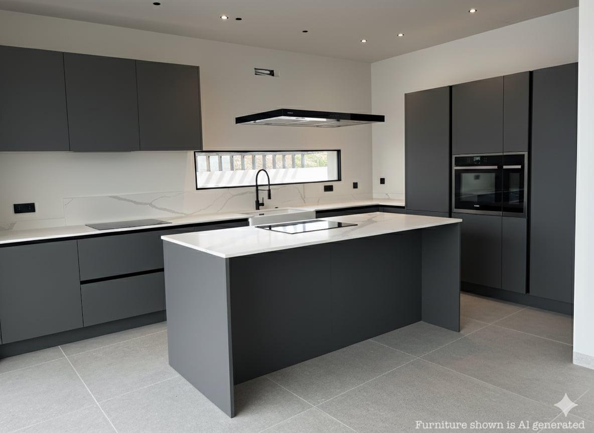Una cocina minimalista ultramoderna con una gran isla y electrodomésticos de alta gama. Vistas panorámicas. Disfrute de vistas panorámicas ininterrumpidas al mar, las montañas y el horizonte de la ciudad desde sus múltiples terrazas.