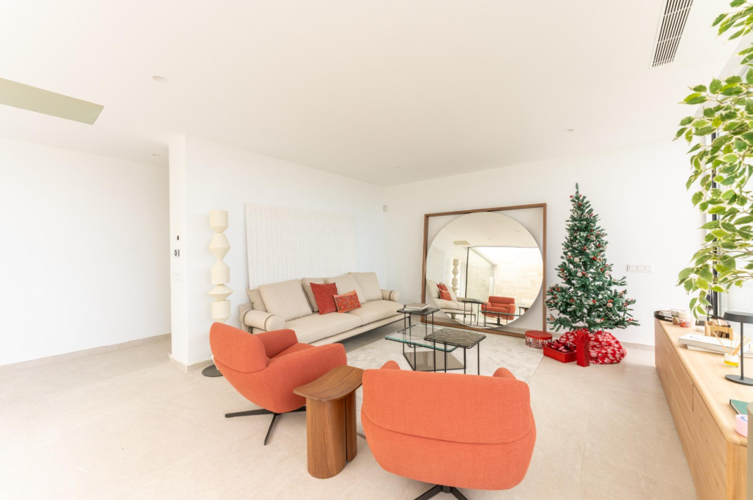 La entrada conduce a la planta superior, donde se encuentra el salón, la cocina abierta equipada con isla central, 2 de los dormitorios y un aseo de invitados. Las puertas correderas de cristal de suelo a techo inundan la villa de luz natural. Un patio sirve como un cómodo comedor al aire libre, aunque también hay mucho espacio en la terraza. Justo fuera del salón se encuentra la terraza con piscina privada y ducha exterior.