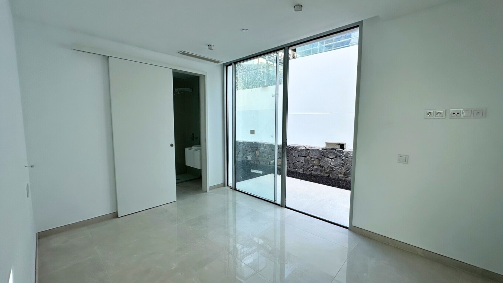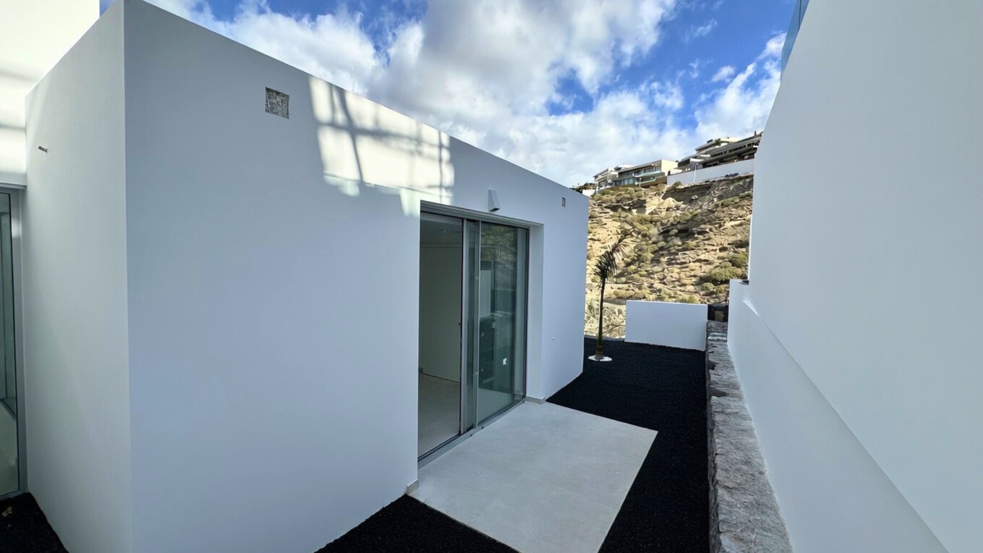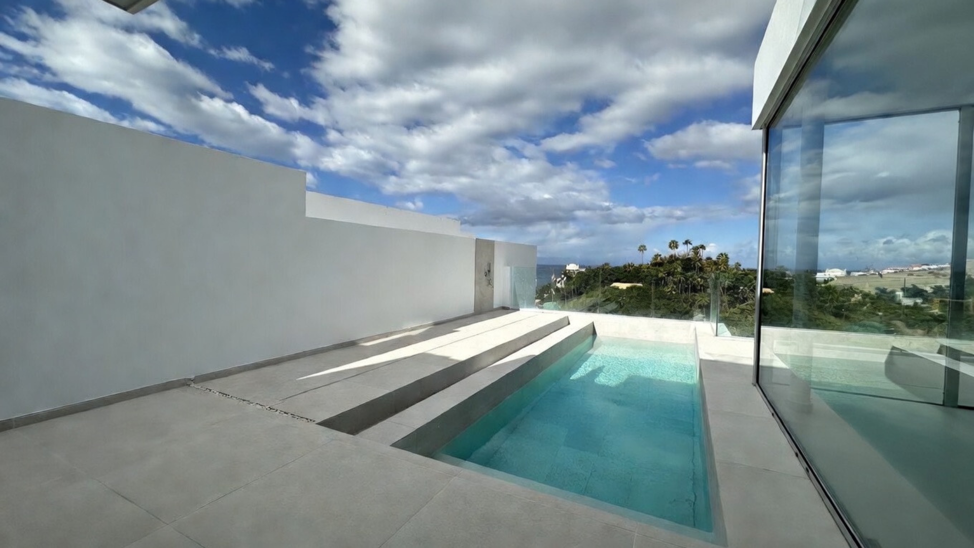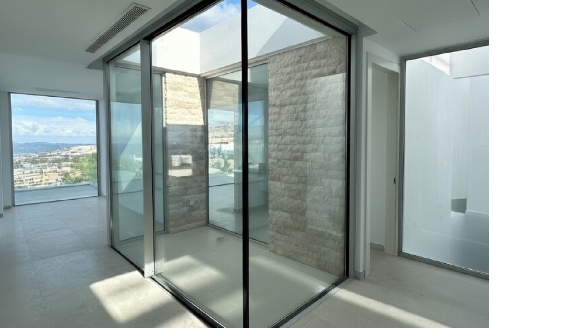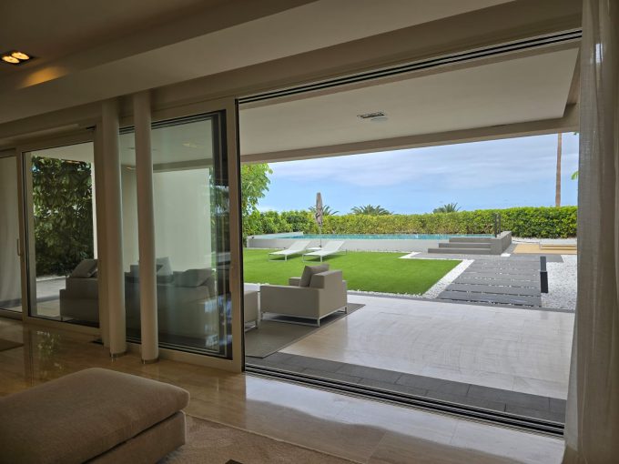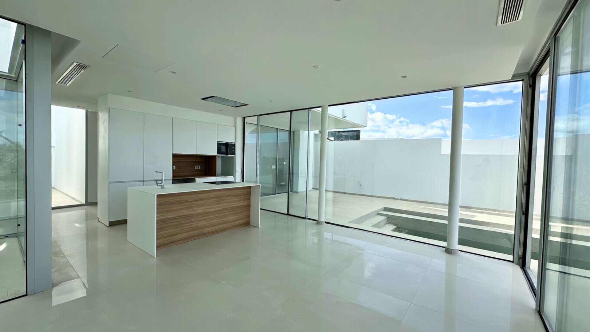 La entrada conduce a la planta intermedia, donde se encuentran el salón, la cocina abierta con isla, dos dormitorios y un aseo de cortesía. Las puertas correderas de cristal de suelo a techo proporcionan abundante luz natural. Justo al lado del salón se encuentra la terraza con piscina privada y ducha exterior.