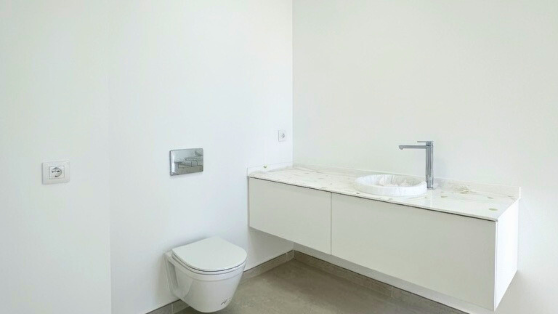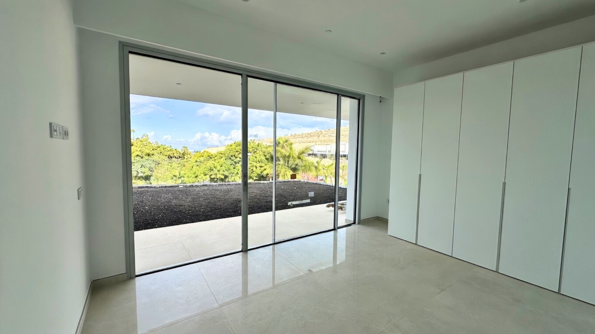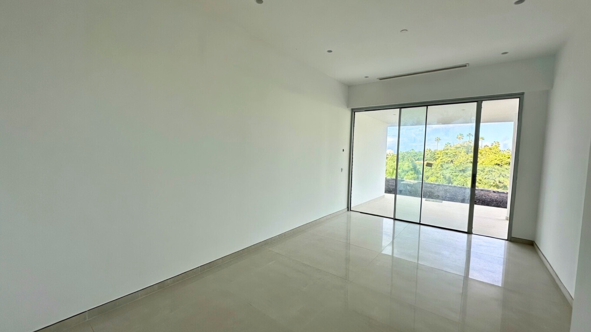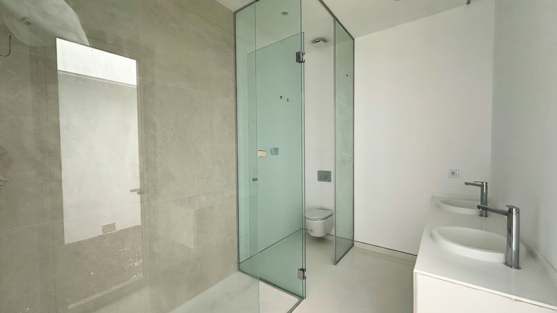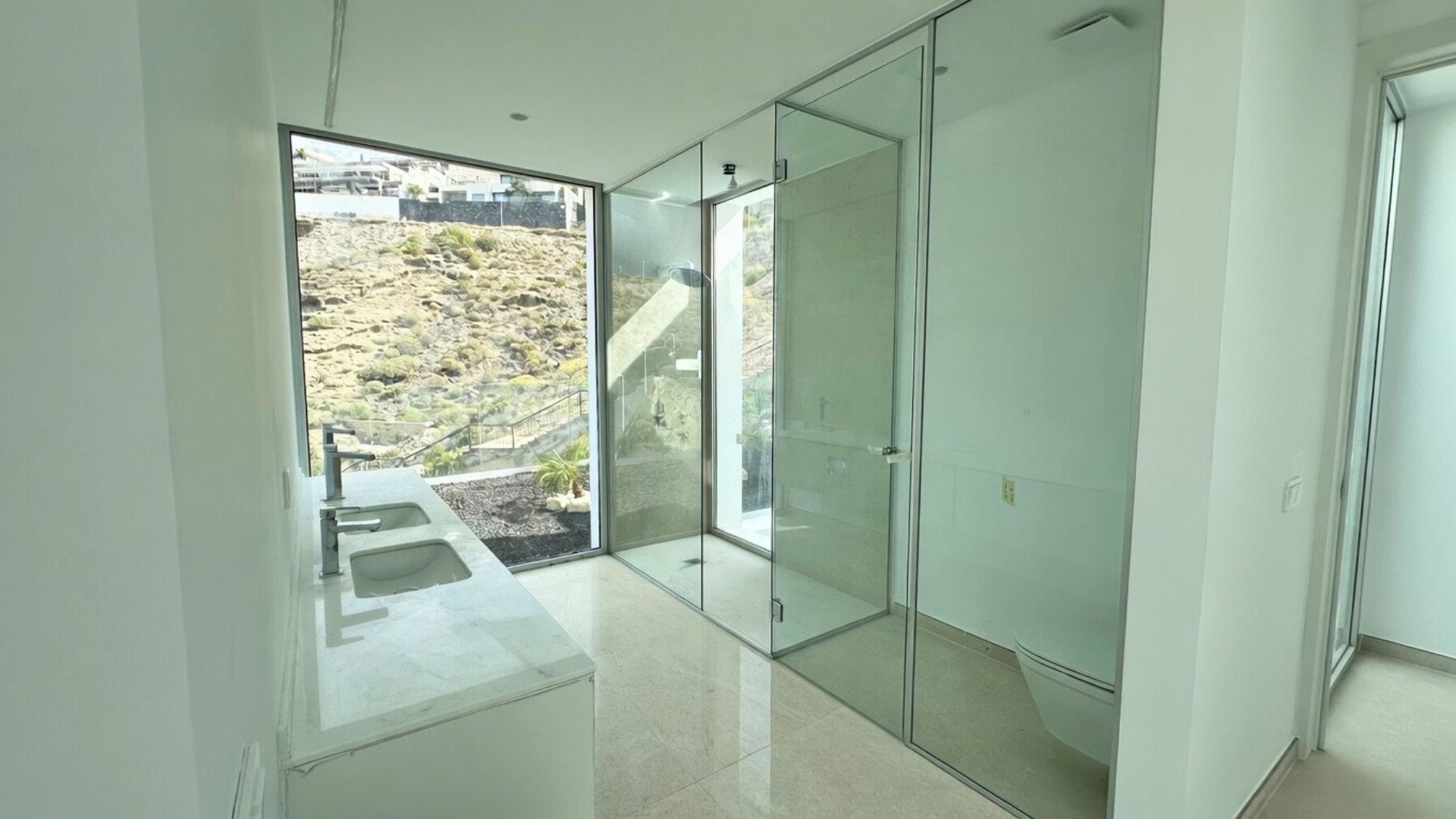 La entrada conduce a la planta intermedia, donde se encuentran el salón, la cocina abierta con isla, dos dormitorios y un aseo de cortesía. Las puertas correderas de cristal de suelo a techo proporcionan abundante luz natural. Justo al lado del salón se encuentra la terraza con piscina privada y ducha exterior.