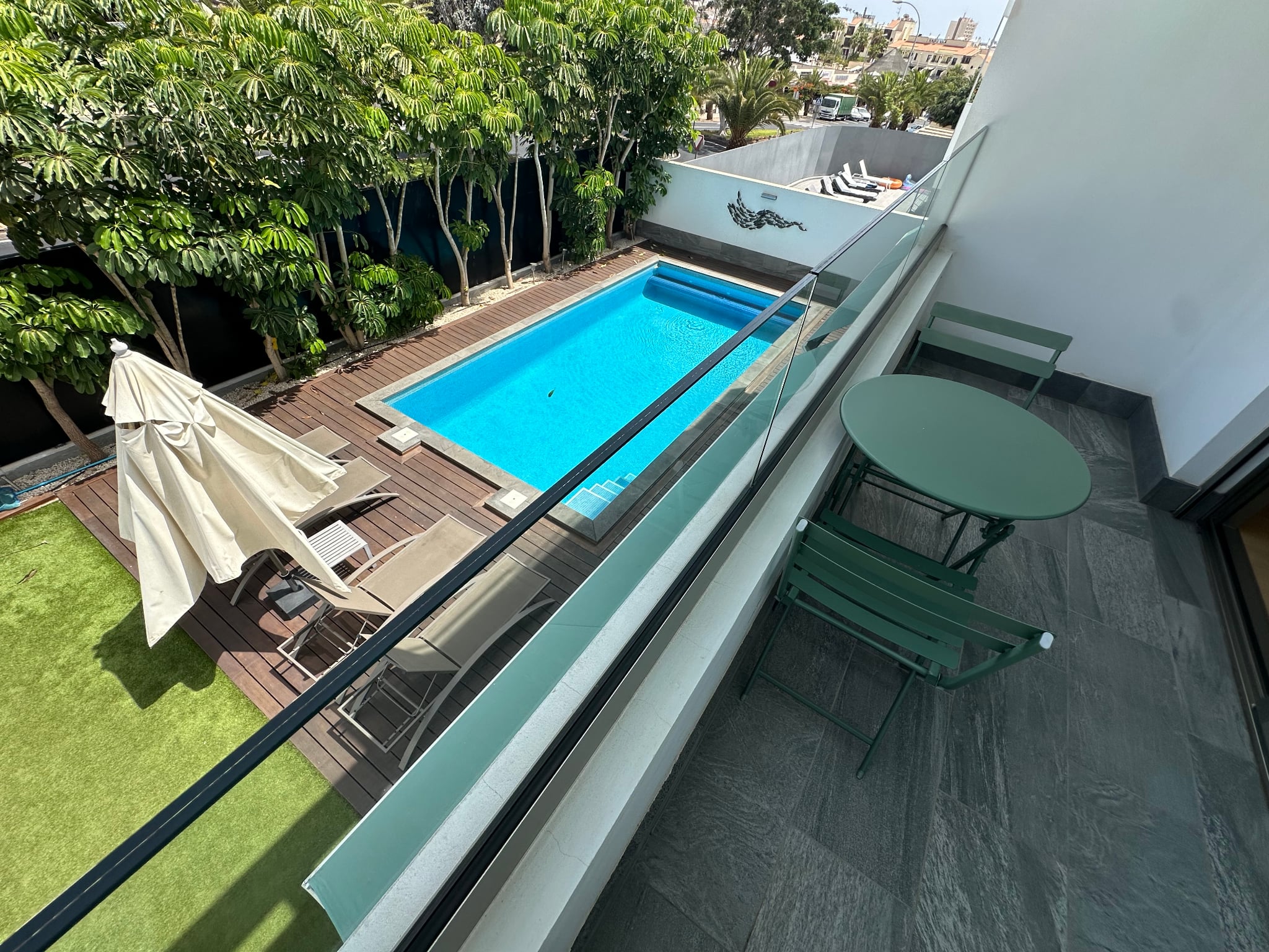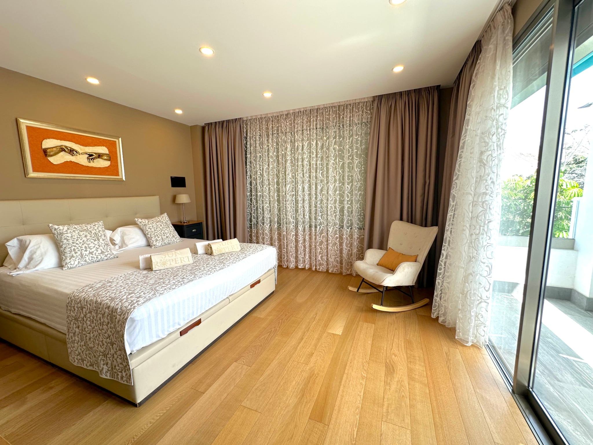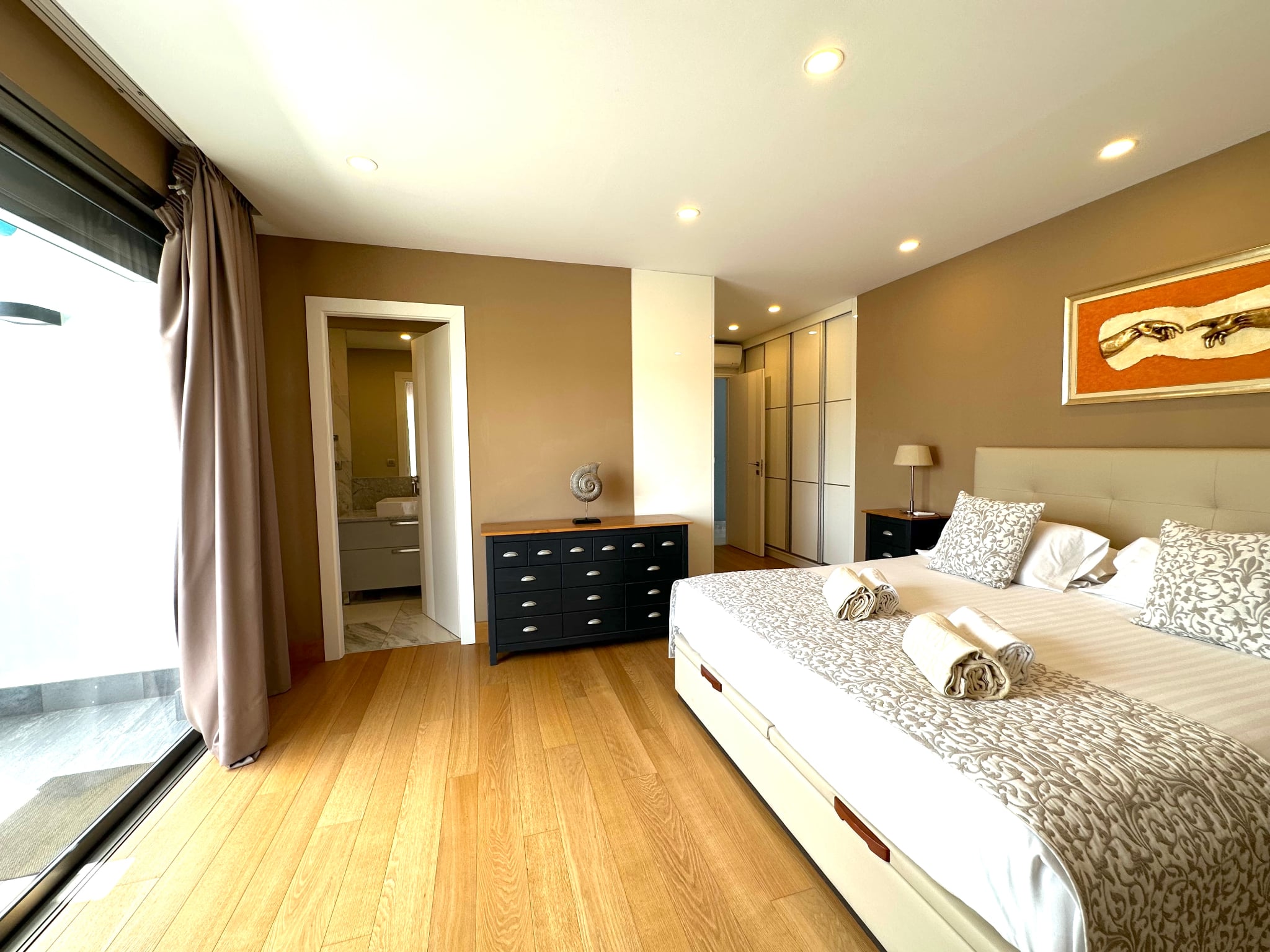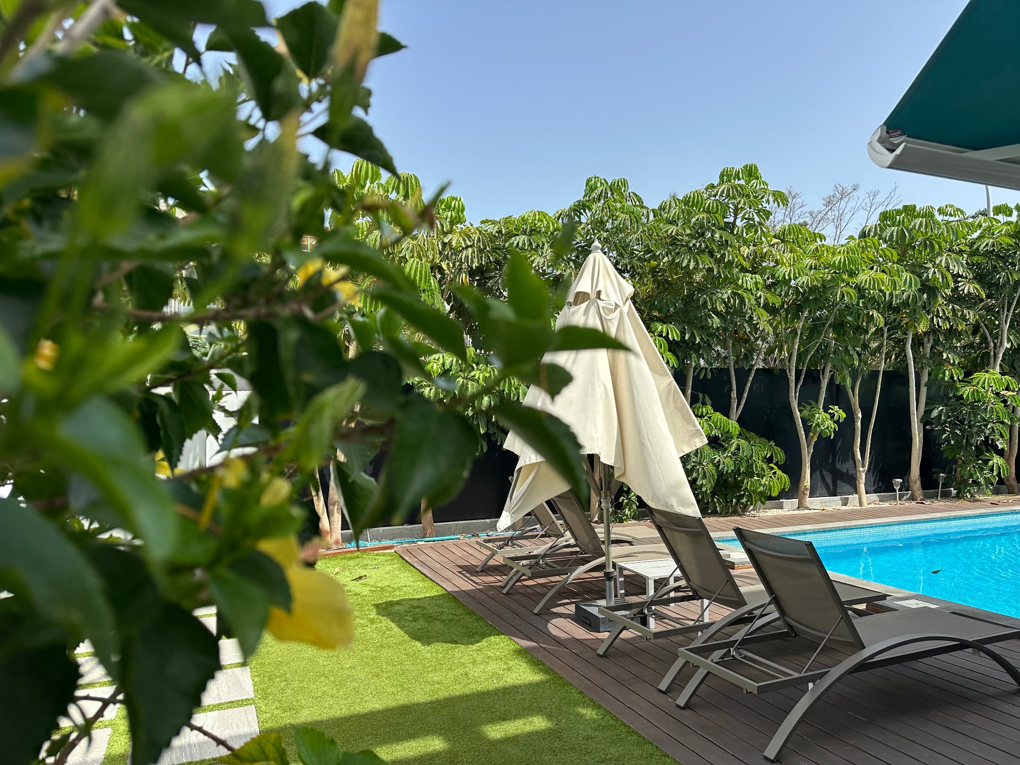 La villa cuenta con 3 amplios dormitorios, todos con baño en suite, suelos de madera y terrazas privadas que garantizan la privacidad.