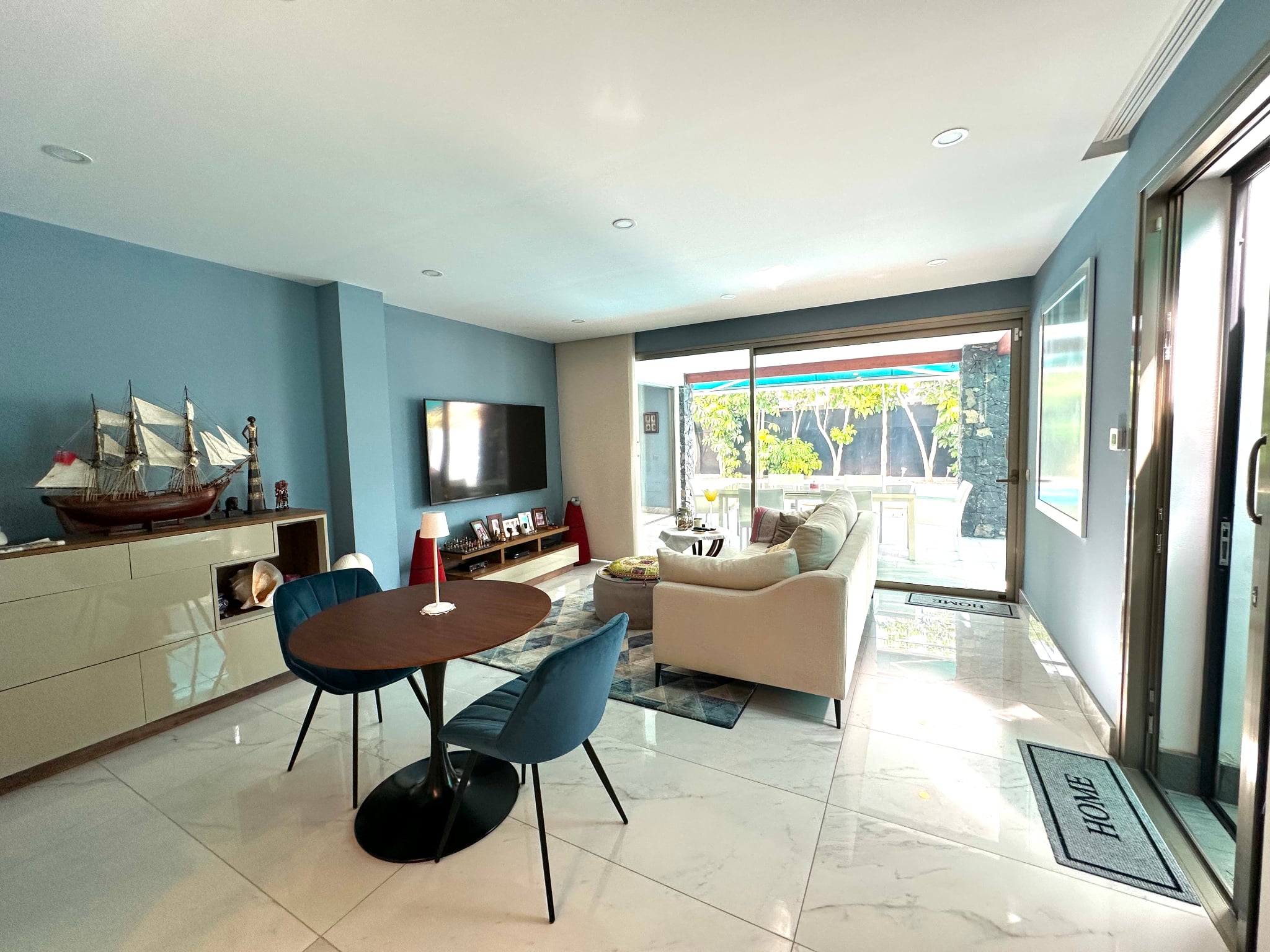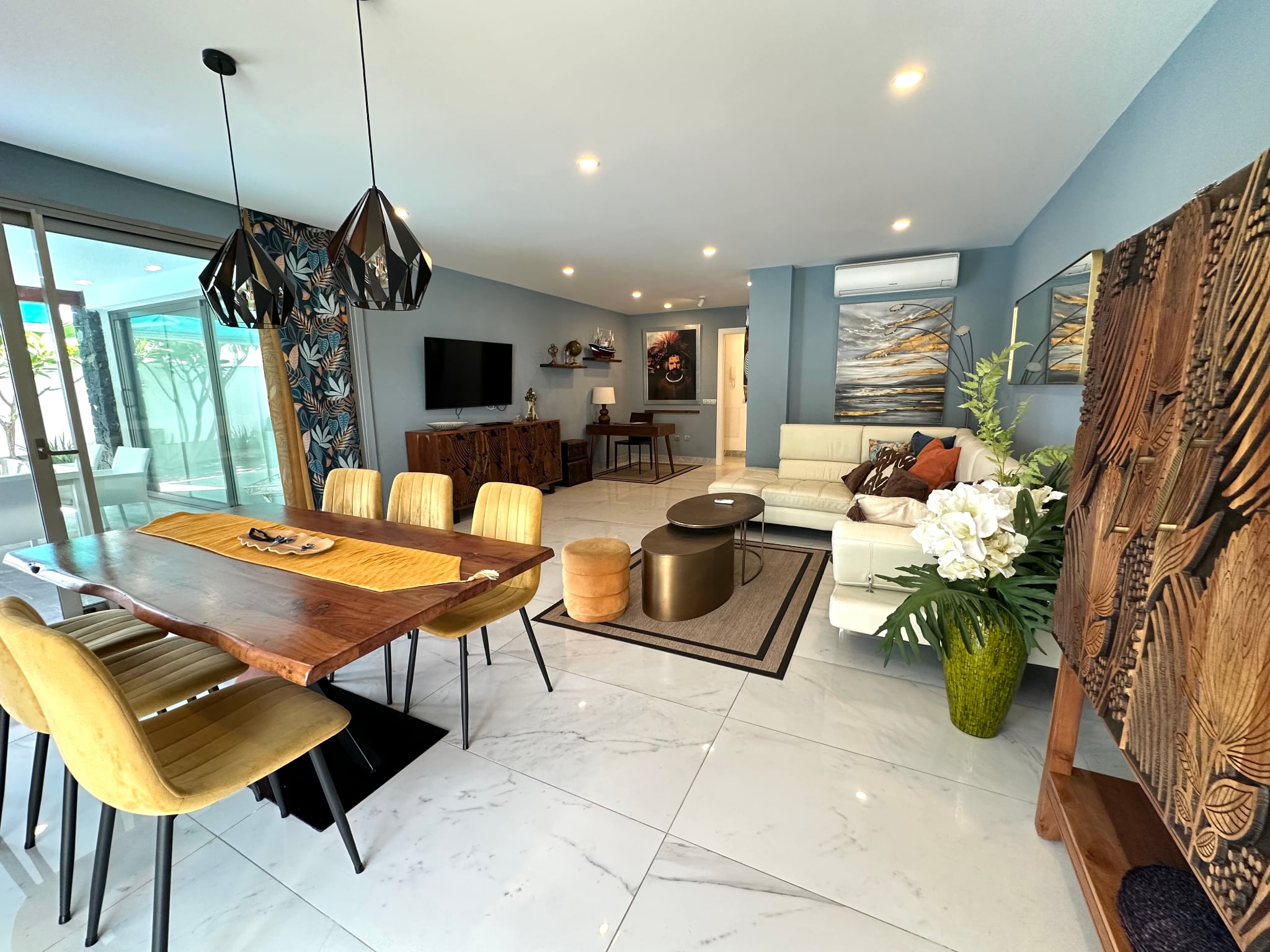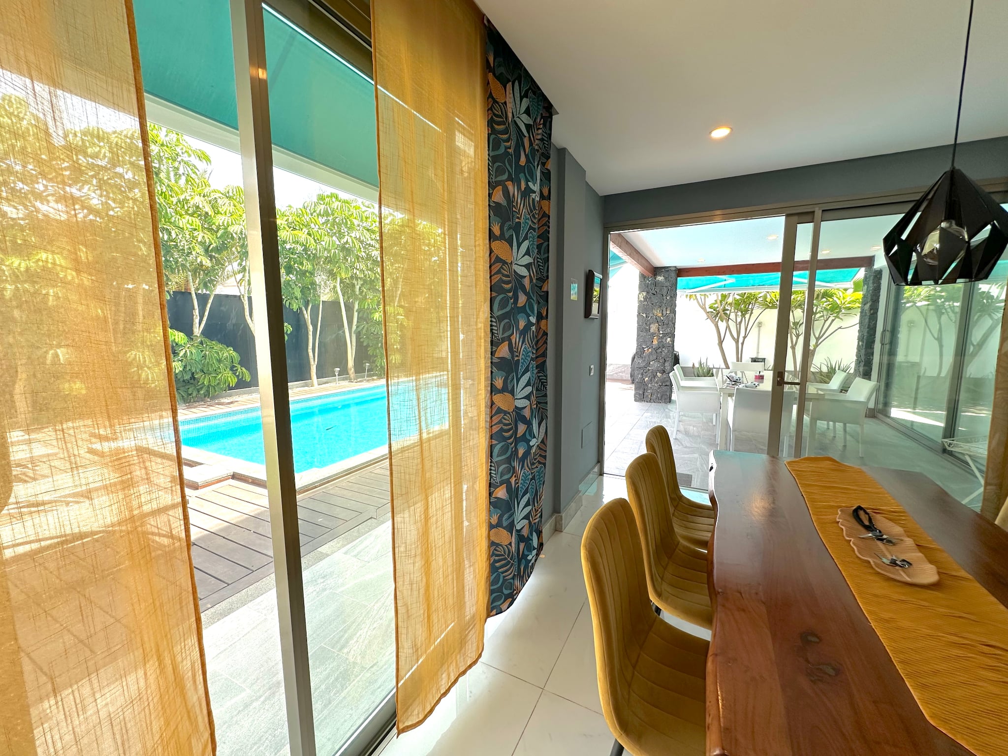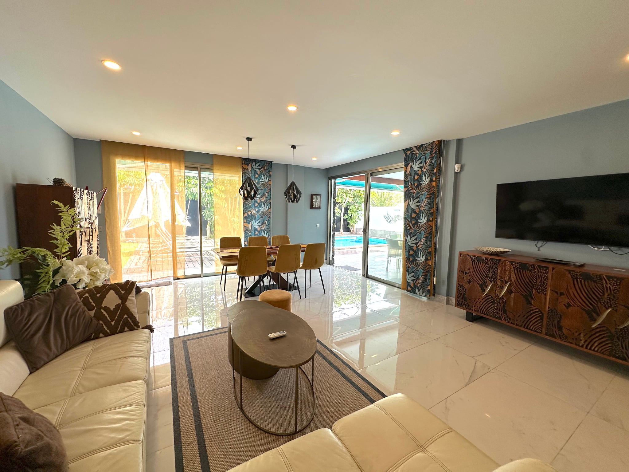 La villa cuenta con 3 amplios dormitorios, todos con baño en suite, suelos de madera y terrazas privadas que garantizan la privacidad.